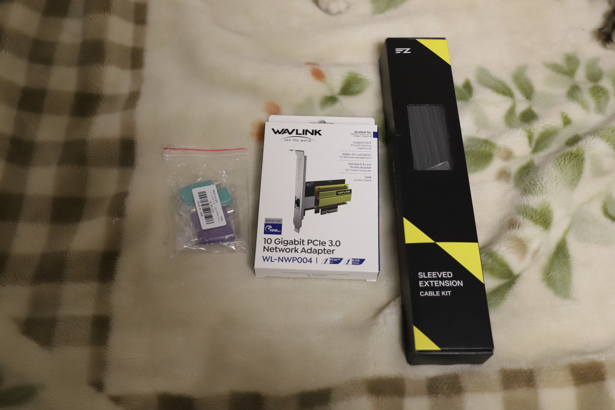 電源の延長ケーブル、格安10GのLANカード、USBをPPS/2に変換するやつ。
